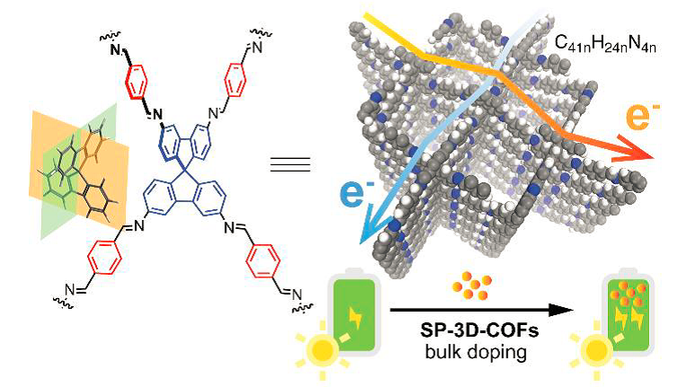 该团队以螺二芴为核心三维构筑单元,通过精巧的供体-受体骨架构建,利用席夫碱反应首次合成了长程共轭的三维COFs材料。借助于席夫碱反应合成产物的基团效应,该材料展现出光响应长程电荷分离的能力,并通过简单掺杂使钙钛矿太阳能电池光电转换效率显著同比提升了15-18%,达到19.1%的最高光电转化效率。研究成功利用三维COFs架空框架避免电荷重组耗散的优势,为钙钛矿太阳能电池光电转换效率向理论极限进一步迈进开辟了一条可行之径。该工作发表于J. Am. Chem. Soc.,2018,140, 10016−10024.