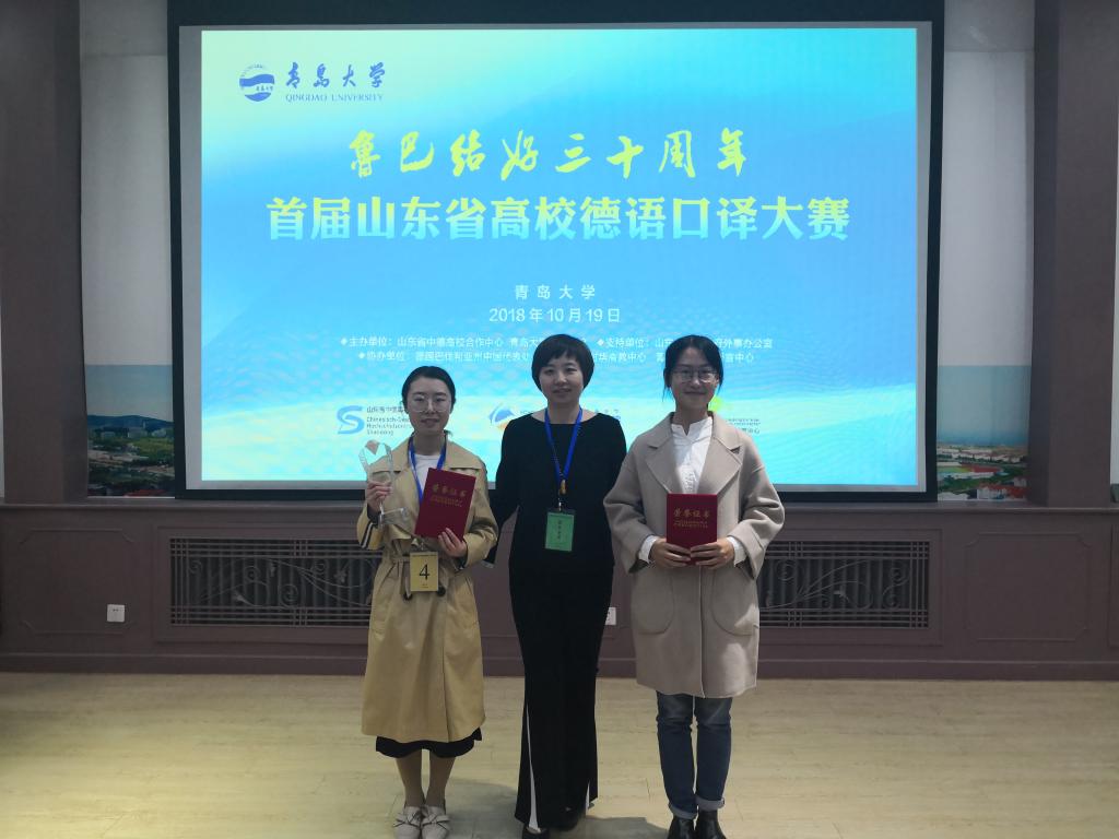 10月19日,由山东省中德高校合作中心、青岛大学外语学院主办的首届山东省高校德语口译大赛在青岛大学举行。山东省外办、中德生态园管委会、北京大学、华东师范大学、德国巴伐利亚州驻四川代表处和山东代表处的相关专家出席并担任专家评委。学校外国语学院派出的两名同学分别获得一等奖和三等奖的好成绩。