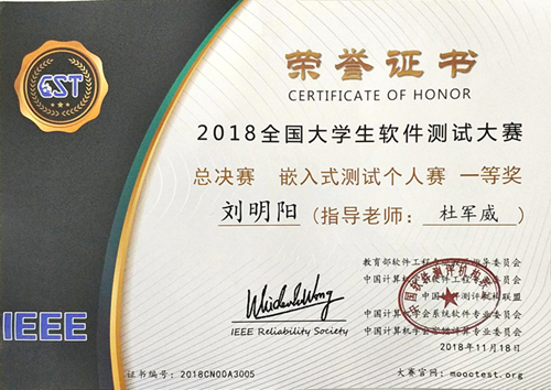 11月18日,2018全国大学生软件测试大赛颁奖典礼在南京大学礼堂举行,伟德国际1949官网信息学院参赛选手在本项赛事中获得佳绩。计算机161班刘明阳荣获“旋极杯嵌入式测试”全国总决赛个人赛一等奖;计算机161班李奇伟荣获全国总决赛个人赛二等奖;软件151班安仲辉荣获“上海软件中心杯开发者测试”全国总决赛个人赛二等奖;宋金明等同学荣获这两项赛项个人赛三等奖8项;学校荣获大赛“最佳组织奖”;信息学院杜军威老师荣获 “优秀指导教师”。