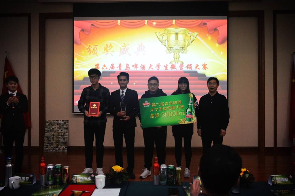 为提升新时代大学生的微营销理论和实践应用能力,12月3日,由山东省学生联合会主办、中国海洋大学承办、青岛啤酒股份有限公司协办的“精酿新时代,畅享微营销”第六届青岛啤酒大学生微营销大赛决赛答辩会在青岛啤酒博物馆成功举办。机电学院吕志成、孙晓东、穆彦名、赵小莉、陈沫等5名同学组成的诗酒情怀团队夺冠,并获得青岛啤酒官方管理培训生offer和三万元奖学金。