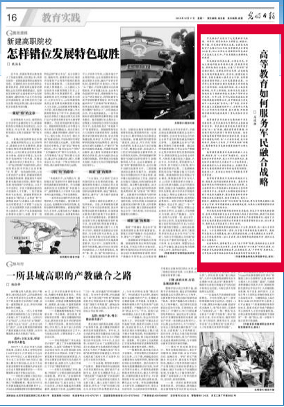 12月17日,《光明日报》教育实践版刊发了党委书记、校长马连湘的署名文章《高等教育如何服务军民融合战略》。
