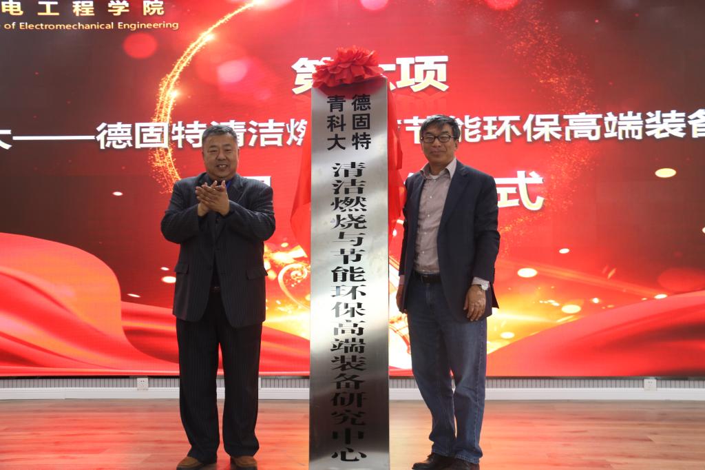 张元利、青岛德固特节能装备股份有限公司董事长魏振文为青科大德固特清洁燃烧与节能环保高端装备研究中心揭牌。