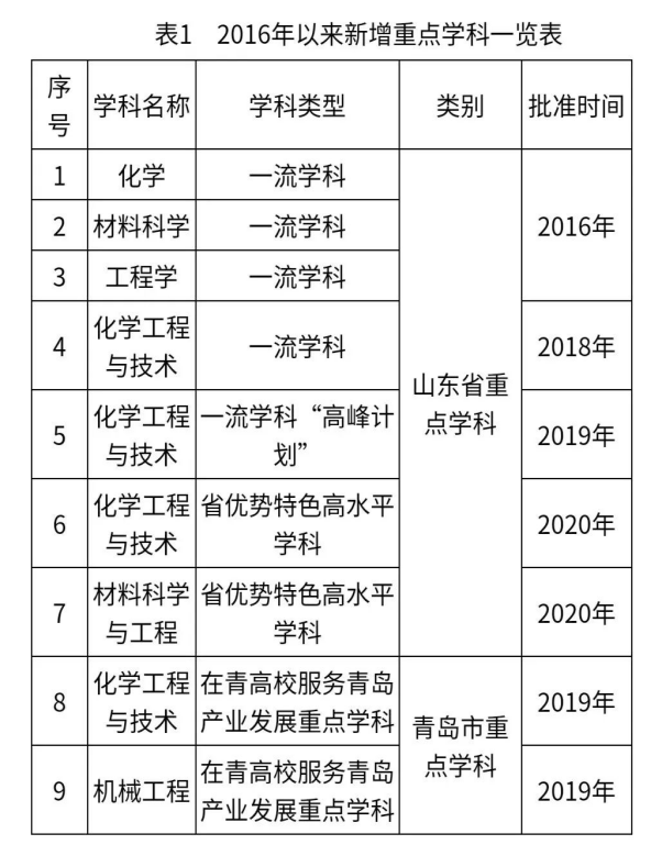 2016年化学、材料科学、工程学3个学科入选山东省重点建设“一流学科”行列;2018年化学工程与技术入选省一流学科,并于2019年入选省一流学科“高峰计划”A类学科;2020年化学工程与技术、材料科学与工程2个学科入选山东省“优势特色”类高水平学科,学校入选山东省“强特色”类高水平大学;2019年化学工程与技术、机械工程入选在青高校服务青岛产业发展重点学科(表1)。目前伟德官网US News世界学科排名上榜7个学科,化学工程与技术位列第102位。在全国第四轮学科评估中,学校有9个学科进入前70%,其中化学工程与技术为B+,省属高校工科唯一(表2)。