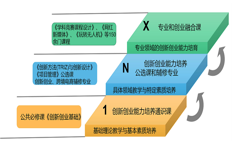 课程是高校开展创新创业教育的主渠道。我们的教育理念是:“不是每一个人都适合创业,但每一个学生都需要创业思维的训练”,所以我们建设了“1+N+X”课程体系。