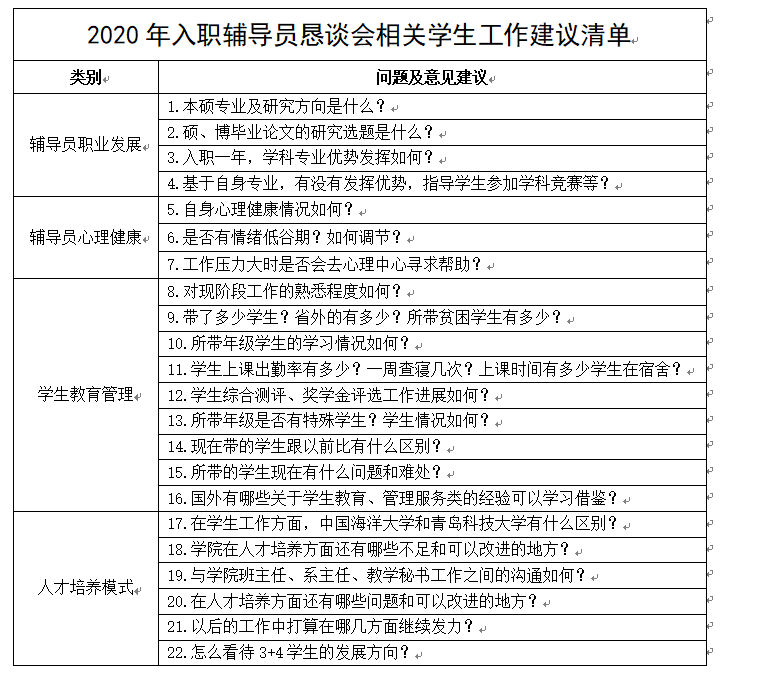 关于印发《2020年入职辅导员恳谈会相关学生工作建议清单》的通知