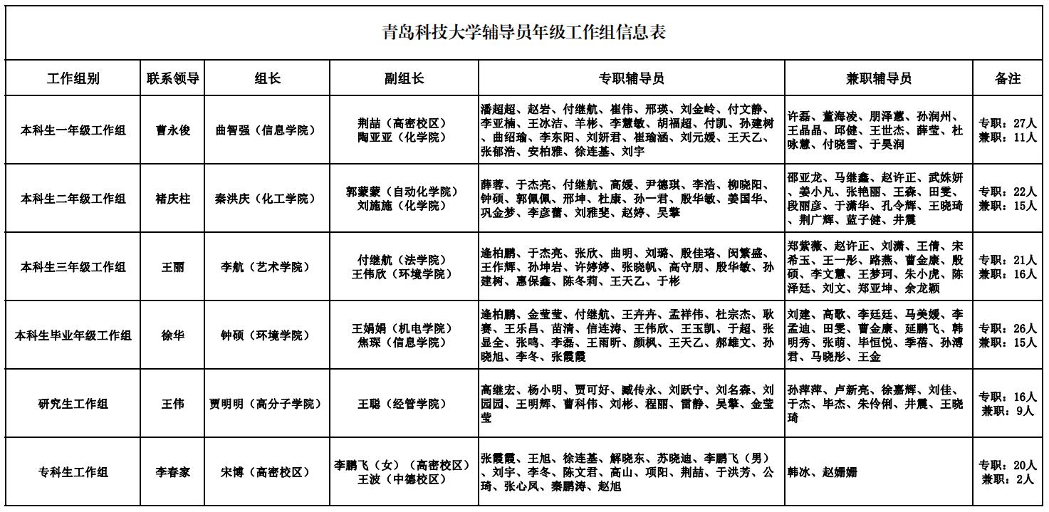 按照学校《关于组建辅导员年级工作组开展工作的通知》要求,经个人申请、学院推荐、学校综合评定,成立了伟德国际1949官网辅导员年级工作组,选聘了6位处级干部联系各年级工作组,并确定了17名组长、副组长人选,现予以公布。