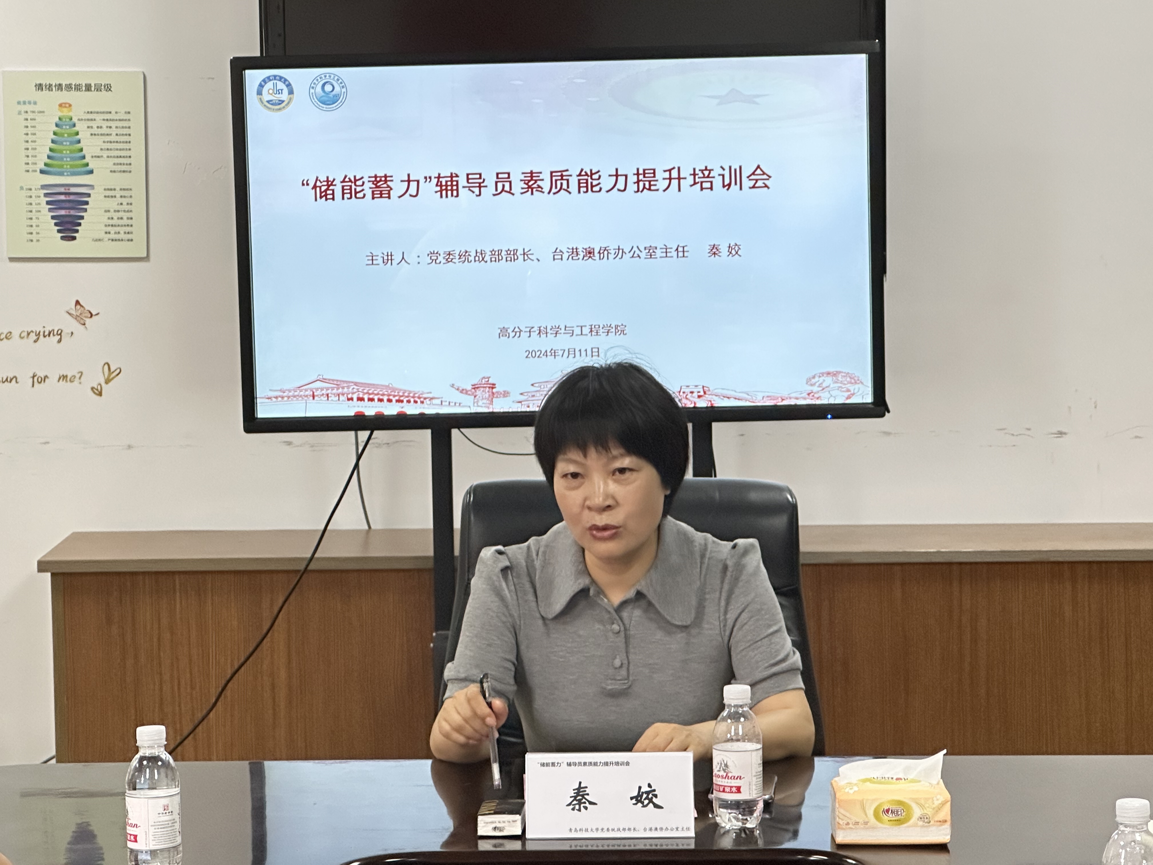 为不断提升辅导员的工作水平和专业素养,全面落实立德树人根本任务,7月11日上午,高分子学院在402会议室开展“储能蓄力”辅导员素质能力提升培训会,党委统战部部长、台港澳侨办公室主任秦姣受邀为全体辅导员作专题培训。培训由高分子学院党委副书记兼副院长贾明明主持。