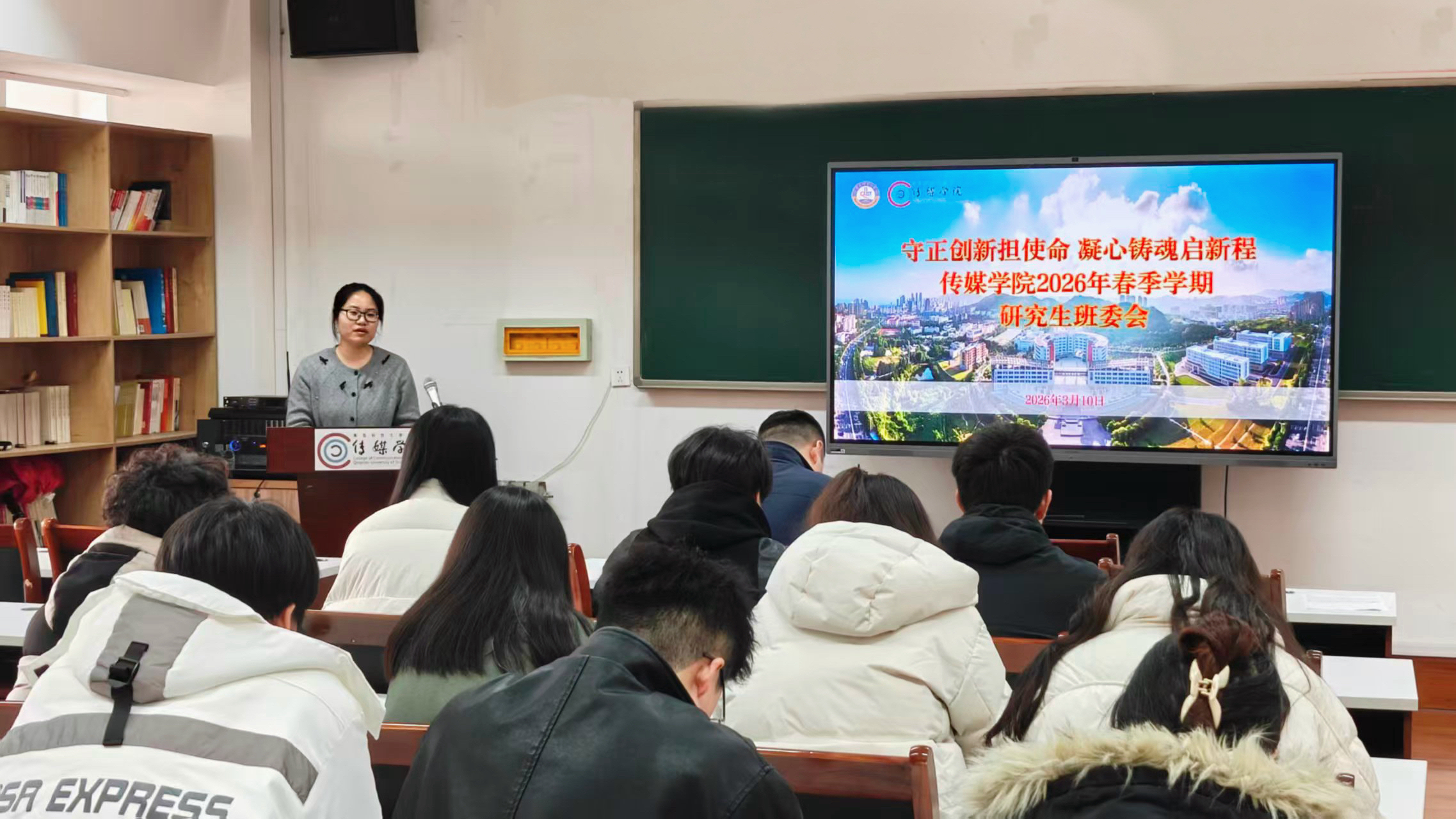 刘海波对学院研究生骨干过去一年的付出表示诚挚感谢,对各项工作取得的成效给予充分肯定。结合新学期研究生培养与班级管理工作要求,他对全体学生骨干提出三点殷切期望:一是找准自身定位发挥“领头雁”作用。要切实增强使命感与紧迫感,精准把握当前传媒硕士培养面临的新情况、新任务,充分发挥研究生骨干的模范带头作用;二是涵养“吃气”的胸襟与“吃苦”的品格。要积极参与各类学团工作,深耕专业学术研究,加强朋辈骨干间的交流互鉴,在比学赶超中实现集体共同成长;三是立足班级岗位职责真抓实干。科学统筹规划2026年春季学期各项工作,抓实抓细、用心用情,密切关注班级同学的身心健康、学业状态与师生沟通情况。
