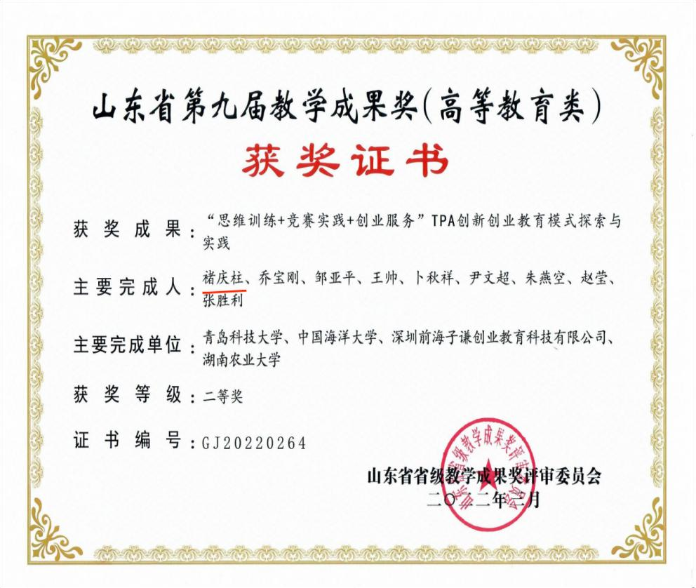 山东省第九届教学成果奖(高等教育类)二等奖:“思维训练+竞赛实践+创业服务”TPA创新创业教育模式探索与实践