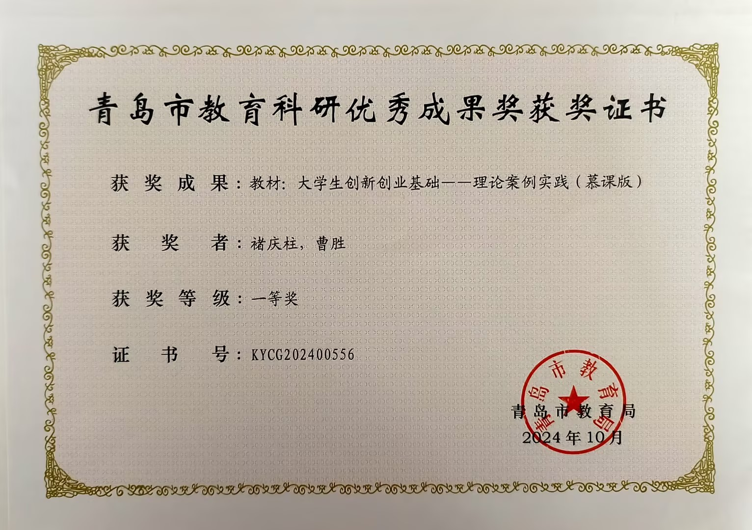 青岛市教育科研优秀成果奖一等奖:教材:大学生创新创业基础——理论 案例 实践(慕课版)